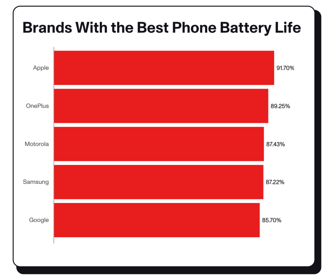 而在整个品牌续航中,苹果也力压其它品牌,成为所有品牌中平均续航最长的,这还是被 iPhone Air 拖了后腿,毕竟这台机器的电池容量仅三千毫安时左右。
